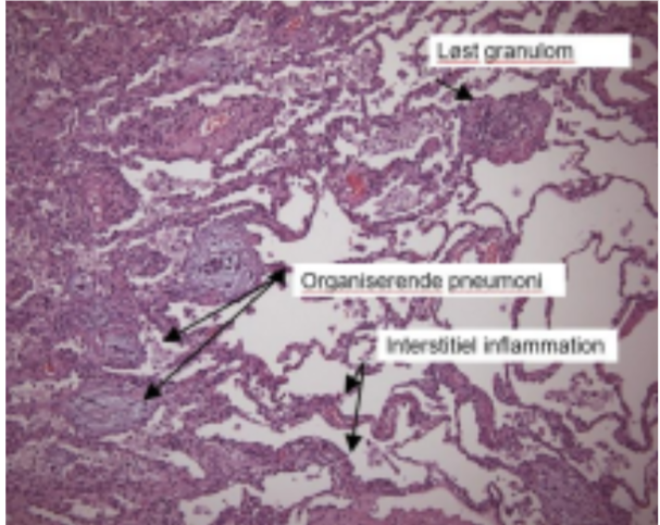 Man kan ofte opnå tilstrækkelig og repræsenta tiv histopatologi ved transbronkiale tang- eller cryobiopsier ved AA, men kirurgisk biopsi kan være nødvendige ved fibrotisk AA. Det histopa tologiske mønster inddeles i ”typisk”, ”forenelig med” og ”indeterminate”, hvor fund af bronkiolo centrisk inflammation, lymfocytær inflammation og løstformede non-nekrotiserende granulomer er klassiske fund ved den non-fibrotiske AA (fi gur 3). Der kan ses områder med organiserende pneumoni (OP) og non-specifik interstitiel pneumonitis (NSIP) foruden fibroseforandringer ved den fibrotiske AA. Fibrotiske forandringer viser sig typisk ved arkitektonisk distorsion, fi broblastfoci og bikagetegning, samt luftvejscen treret interstitiel fibrose.