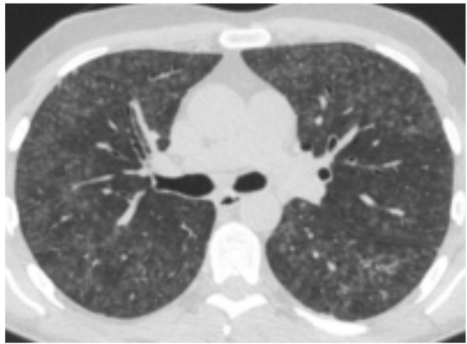 Den typiske HRCT viser diffus matglastegning med involvering af alle lungeafsnit med enkelte sparede lobuli, mosaikattenuering, centrilobulæ re mikronoduli og air trapping (figur 1). Foran dringerne er ofte reversible ved ophør af ekspo nering og med evt. steroidbehandling.